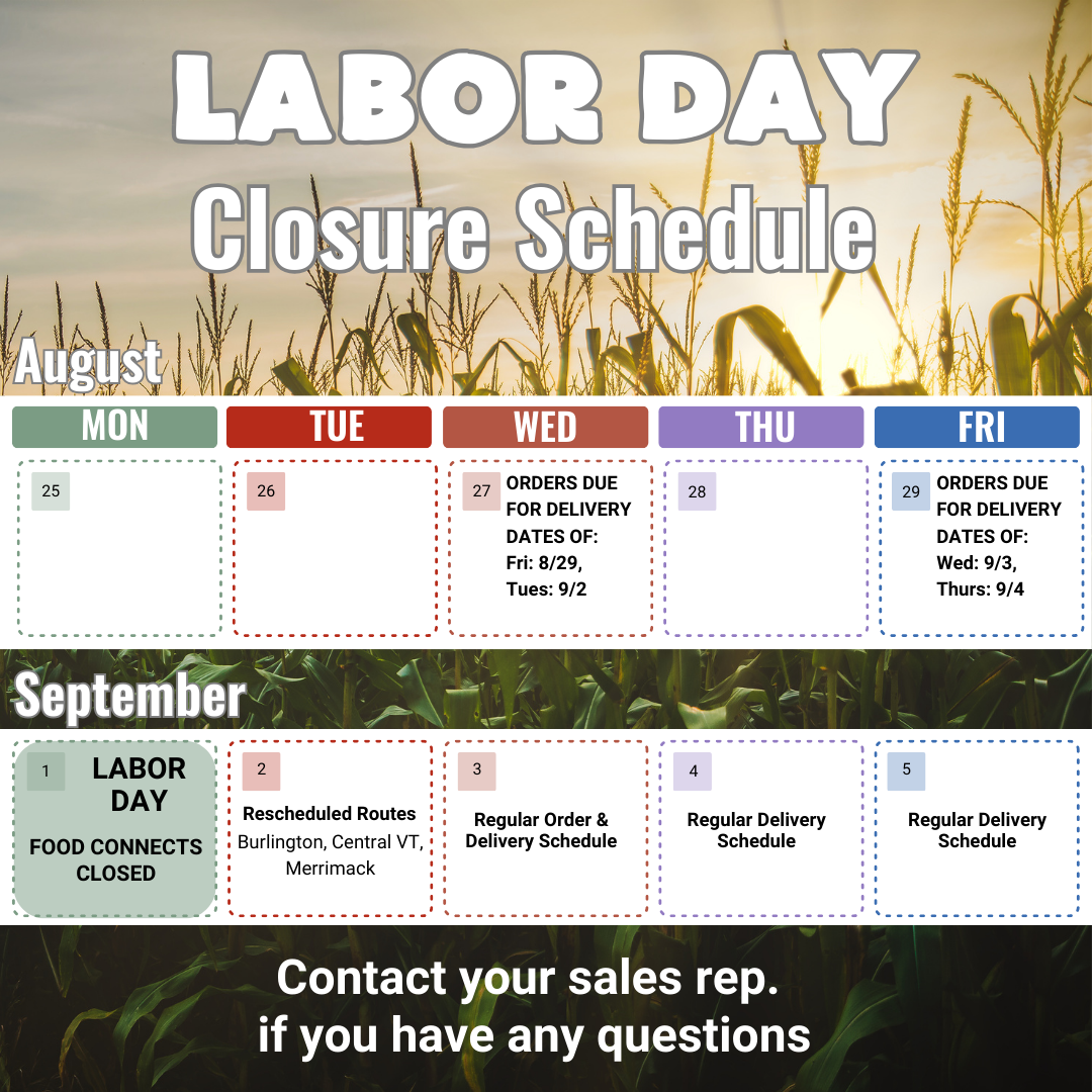 Orders are due Weds, 8/27 at 10 AM for deliveries on Fri, 8/29 & Tues, 9/2.