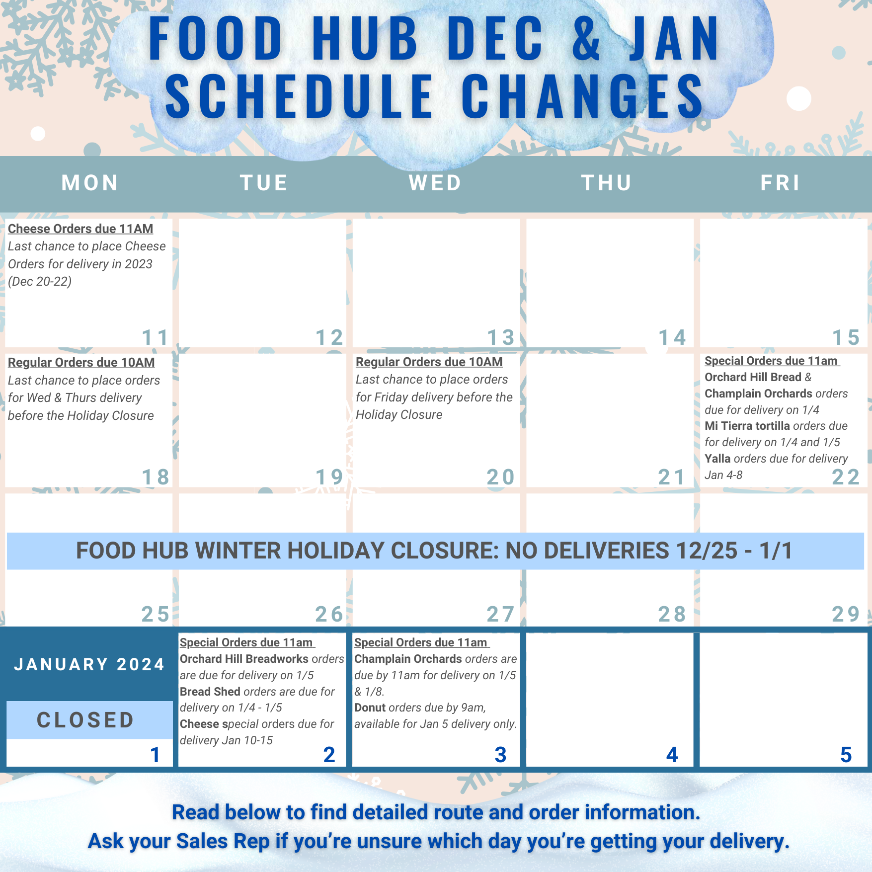 The Food Hub will be CLOSED from Dec 23, 2023 through Jan 1, 2024. We will reopen on Jan 2, 2024