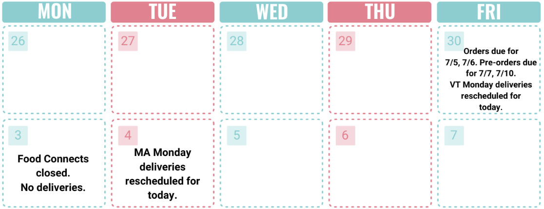 Monday, July 3: The Food Hub Office and Warehouse will be closed, and there will be no deliveries.