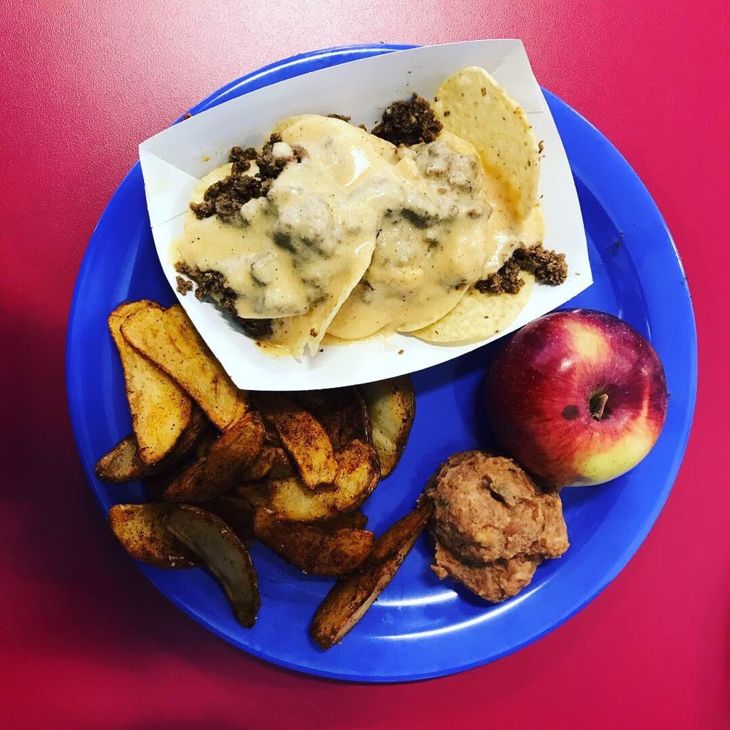 On Tuesdays, we each nachos. For lunch. With refried beans and zesty potato wedges. Top it off with a local apple and you’ve got yourself lunch at Academy School in Brattleboro!